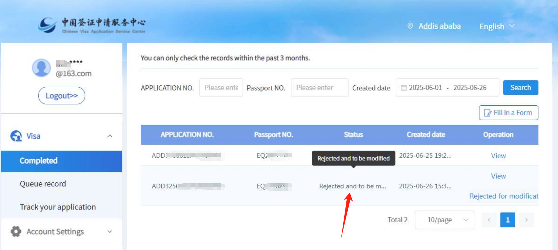 (1)您可能收到邮件要求您提供其他材料或做其他修改,此时申请状态为 “Rejected and to be modified”或“已拒绝并待修改”。