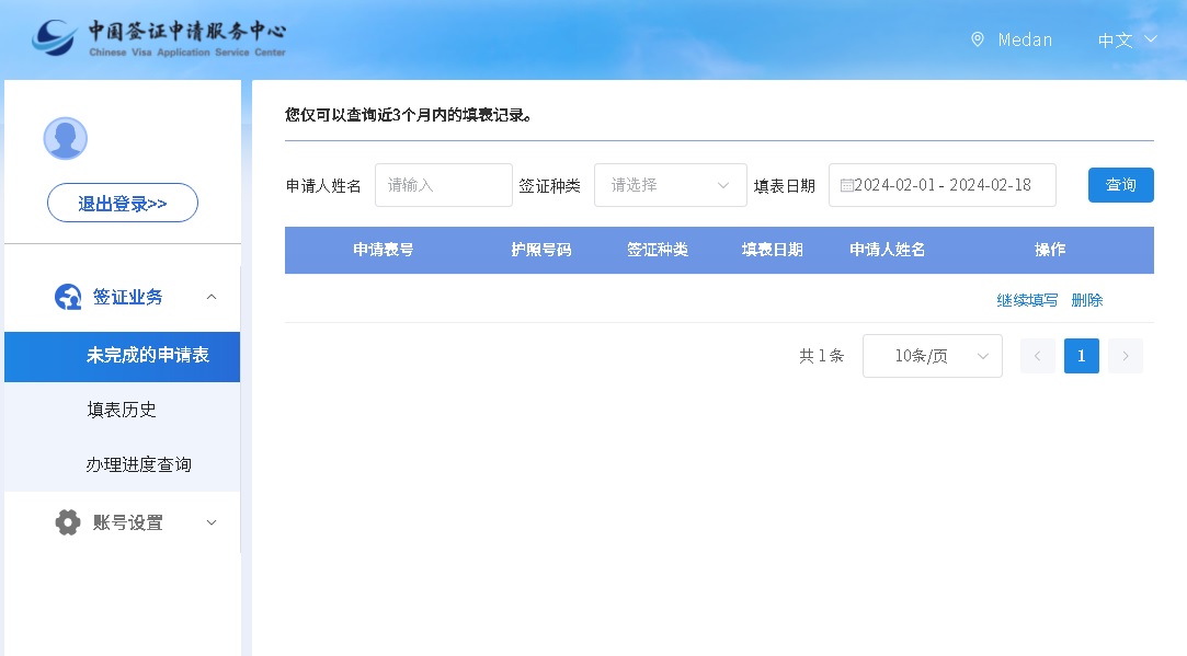 点击“签证业务”→“未完成的申请表”可以查询近3个月内的填表记录,进行未完成申请表的继续填写或删除。