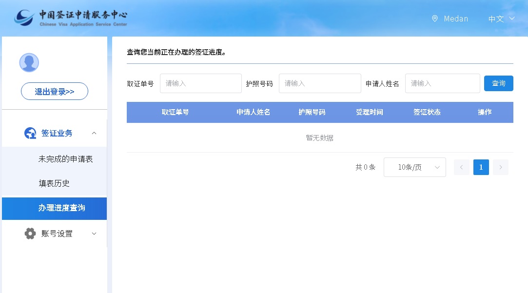 点击“签证业务”→“办理进度查询”可查询当前正在办理的签证进度。