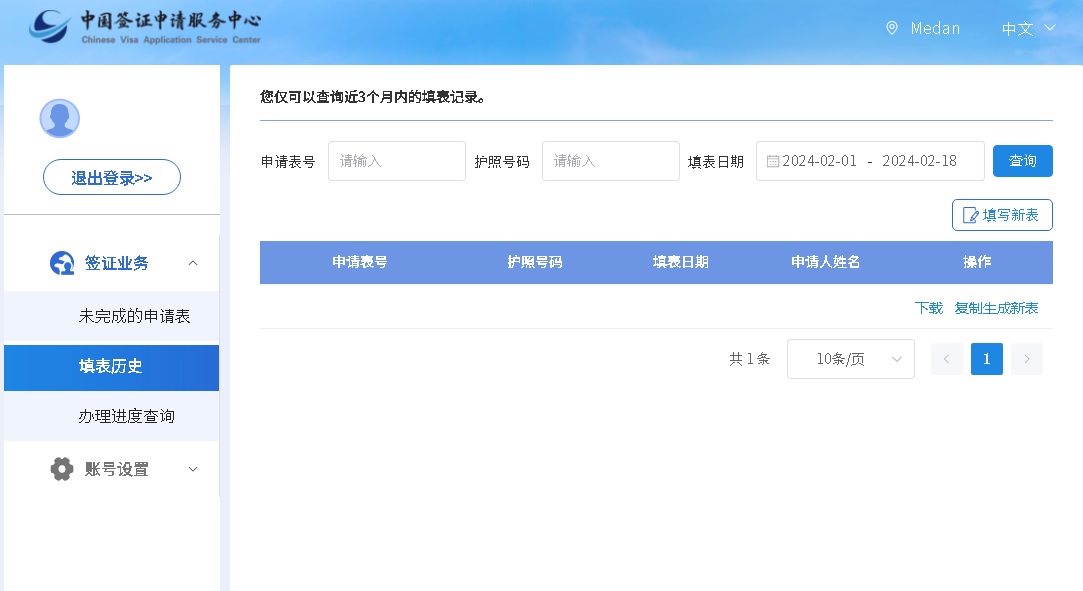 点击“签证业务”→“填表历史”可以查询近3个月内的填表记录,进行已完成申请表的下载或复制生成新表。