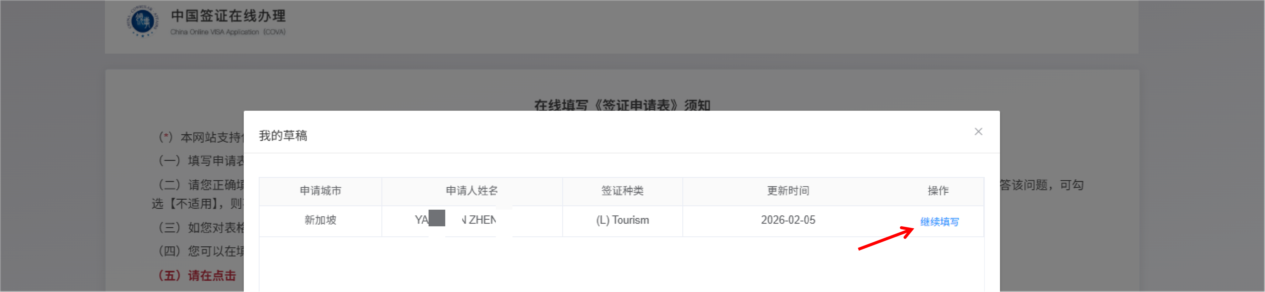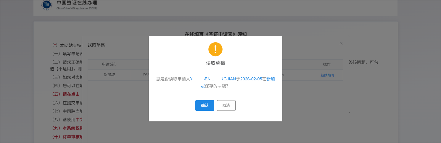 2. 等待几秒,页面会显示您之前保存的尚未完成的申请,点击“继续填写”,并确认,即可读取草稿,继续填写。