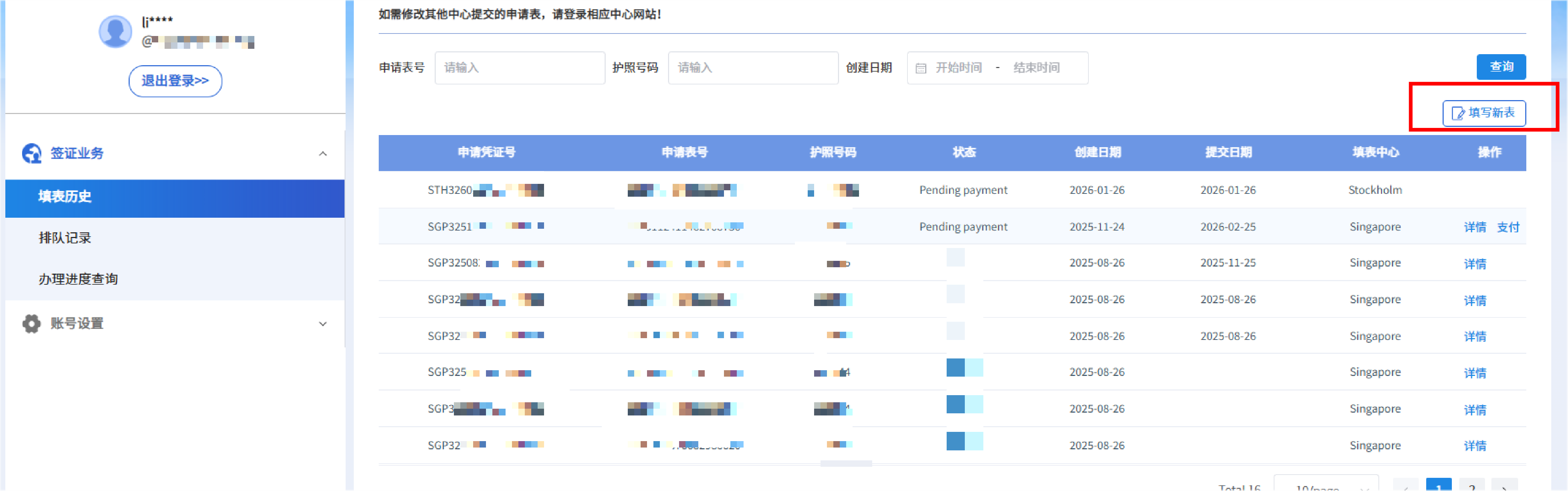 1. 登录“个人中心”后,页面显示的申请为您已填写完成或待支付的申请,点击“填写新表”,页面提示确认提交的心为“新加坡”,如是,点击“确认”。