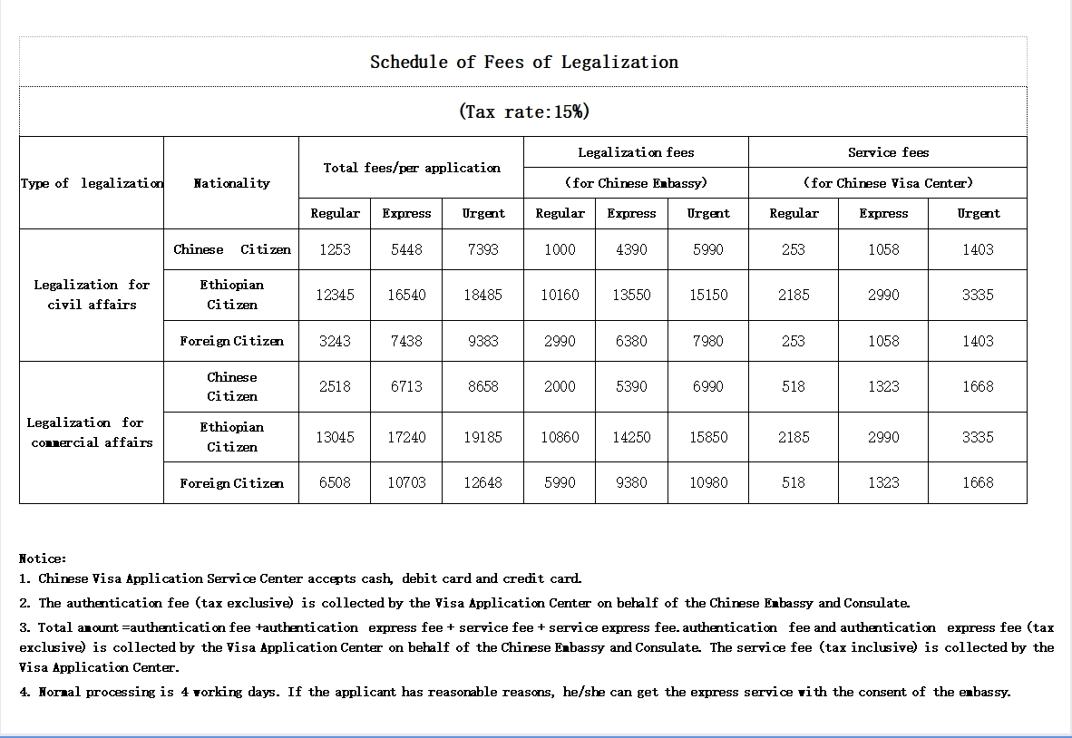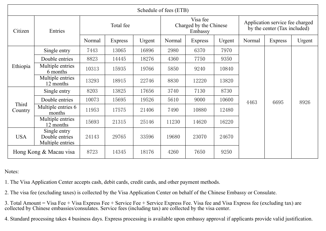 Since 2024, the exchange rate of the Ethiopian Birr against the US Dollar has fluctuated significantly. In accordance with the notice issued by the Center in August 2025, as well as the actual operational conditions and relevant work arrangements of the Center, the Visa Application Service Center hereby decides to implement the service fee adjustment arrangement for the second phase starting from October 31, 2025. Specifically, the service fee will be adjusted to a pricing standard of USD 30 per application based on the exchange rate on October 21. Meanwhile, in line with the requirements specified in the notice issued by the Embassy of the People's Republic of China to the Federal Democratic Republic of Ethiopia on September 30, 2025, the visa fees and authentication fees will also be adjusted accordingly (Website: https://et.china-embassy.gov.cn/lsxx_1/lszj/lingshi123/202509/t20250930_11720756.htm). The specific changes to the fees are as follows: