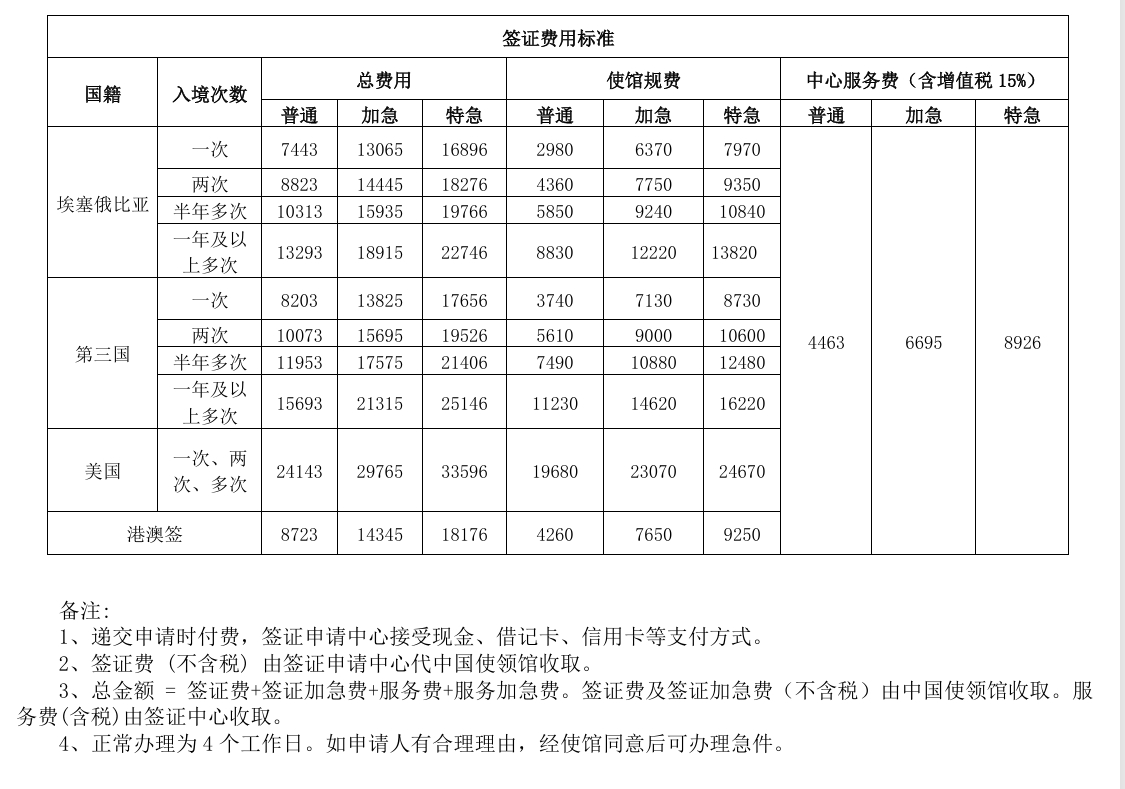 自2024年以来,埃塞比尔兑美元汇率持续大幅波动。根据中心2025年8月通知,以及中心业务运营实际及相关工作安排,签证中心定于2025年10月31日起执行第二阶段服务费调整安排,按照10月21日汇率调整至30美元/件计价标准,并同步按照中国驻埃塞俄比亚使馆于2025年9月30发布的通知要求调整签证费和认证费(网址:https://et.china-embassy.gov.cn/lsxx_1/lszj/lingshi123/202509/t20250930_11720756.htm)。具体费用变化如下: