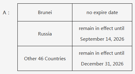 答:目前,中方对文莱持普通护照人员的免签政策未设施行期限,对俄罗斯持普通护照人员的免签政策施行至2026年9月14日,对其余46国持普通护照人员的免签政策施行至2026年12月31日。