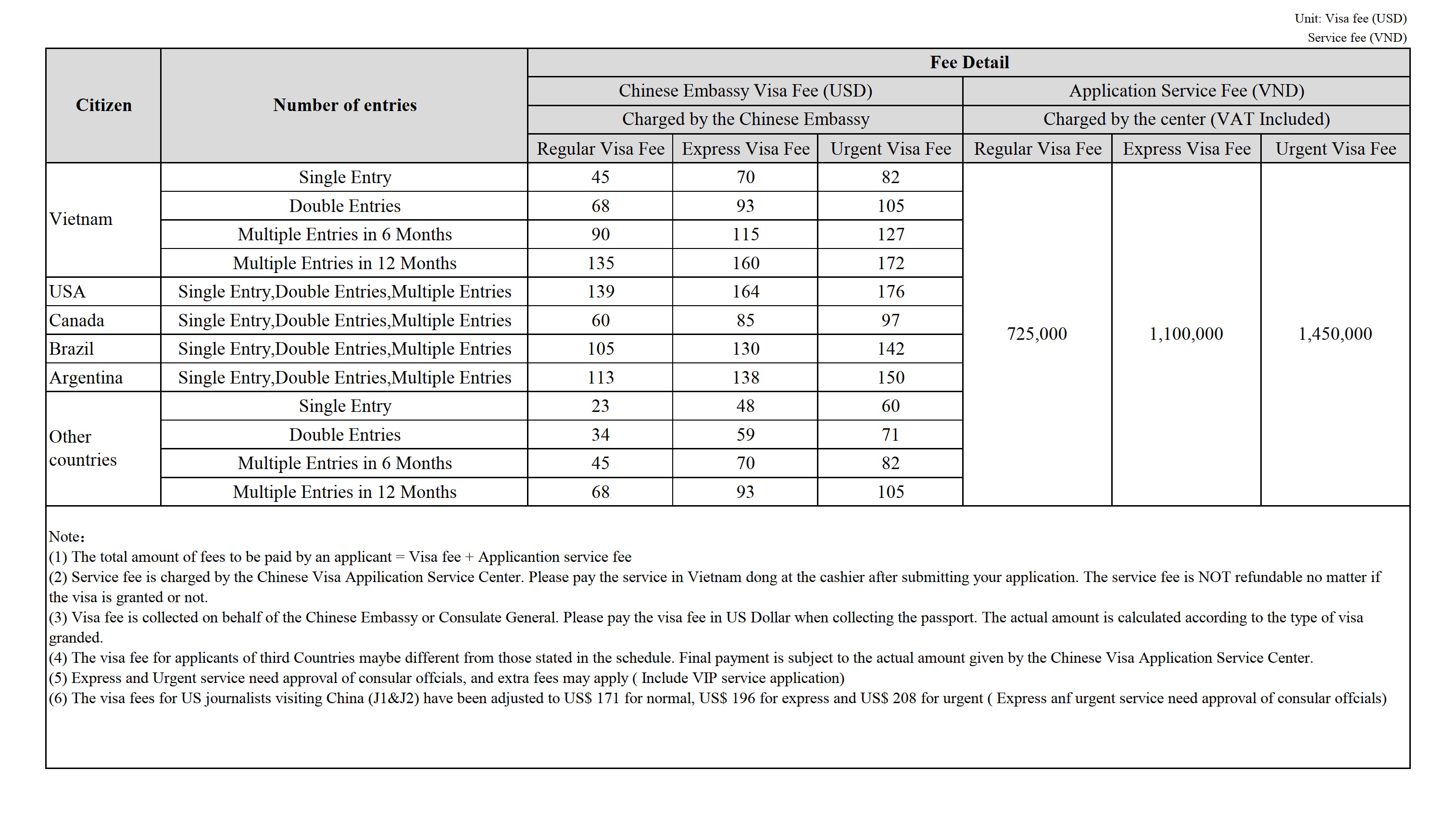 1.Please pay the service fee in Vietnam Dong at the cashier after submitting your application. The service fee is NOT refundable no matter if the visa is granded or not. Please pay the visa fee in US Dollar when collecting the passport. The actual amount is calculated according to the type of visa granded.