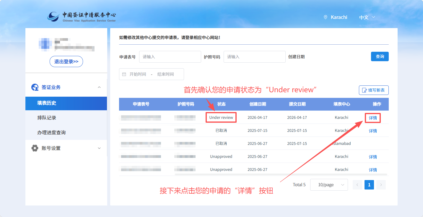 2、在订单页面找到需要取消的申请。首先确认该申请状态为“Under review”,接下来点击“详情”按钮。
