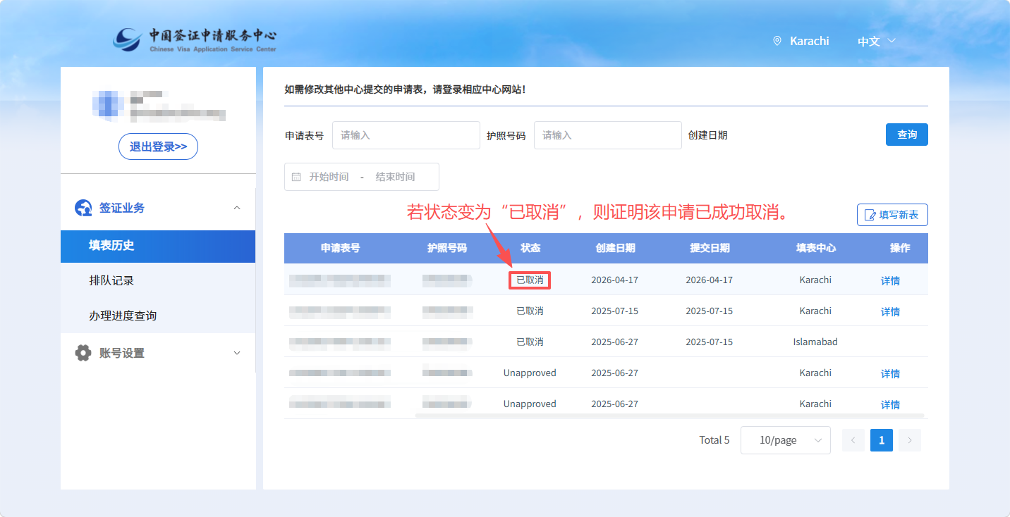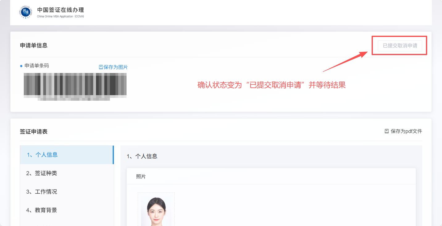 6、若状态变为“已取消”,则证明该申请已成功取消。