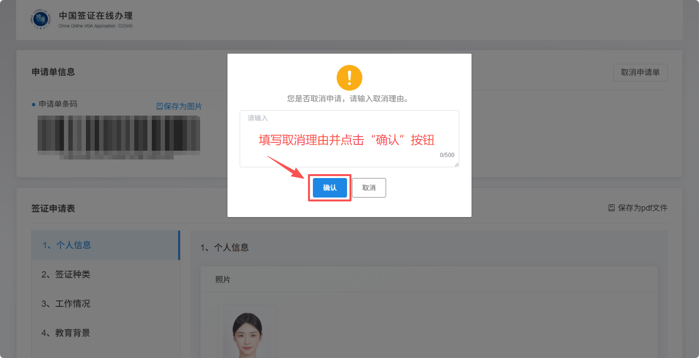 4、在弹出的对话框中填写取消理由并点击“确认”按钮。