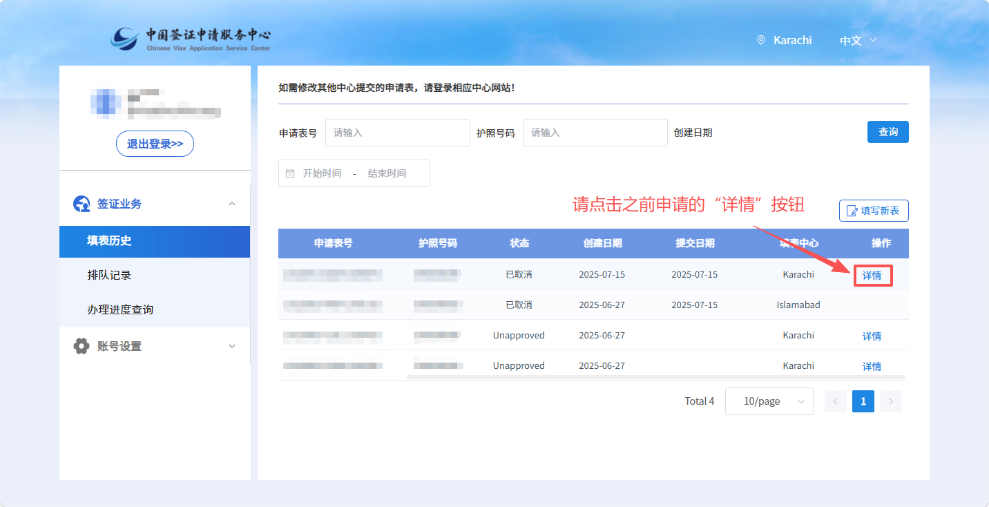 2、在订单页面找到之前的申请并点击“详情”按钮。