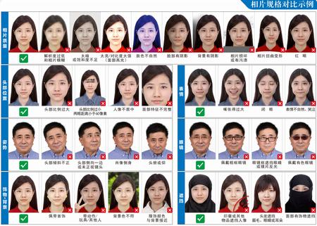 三、照片要易于识别:拍照时正对相机,双眼睁开,嘴唇闭合,露出双耳,神态自然,无任何动作。人脸左右偏转不超过20度,上下仰俯不超过25度。