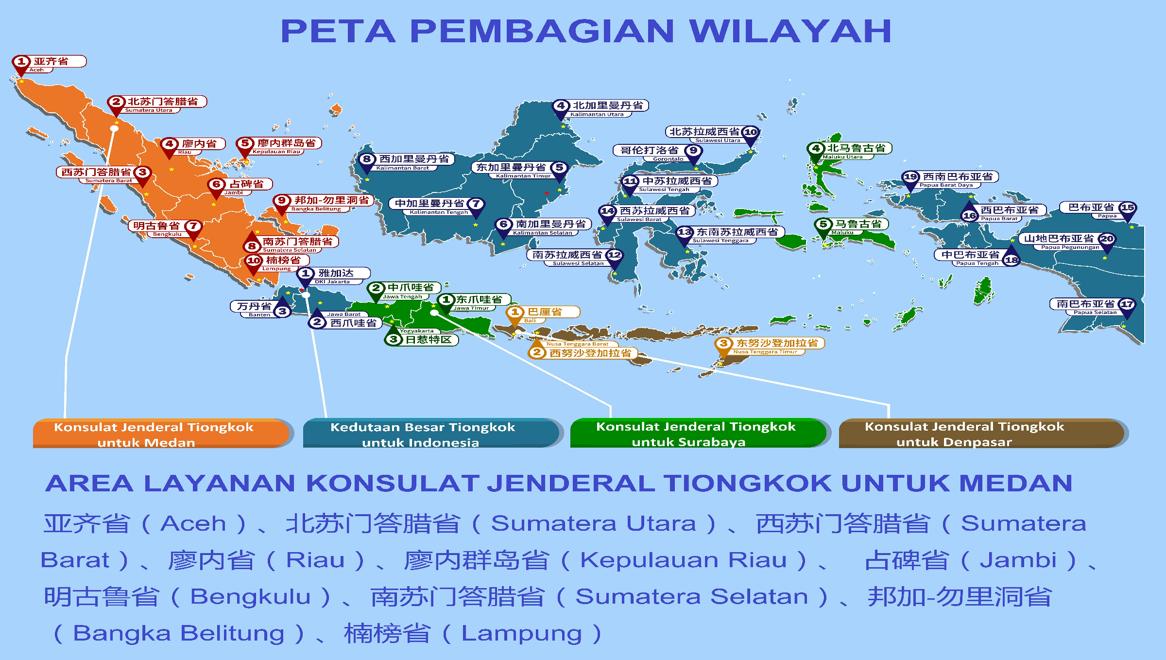 The Consulate General covers 9 provinces and 1 special region: North Sumatra Province, South Sumatra Province, West Sumatra Province, Jambi Province, Riau Province, Riau Islands Province, Bengkulu Province, Lampung Province, Bangka-Belitung Province and Nanggroe Aceh Darussalam.