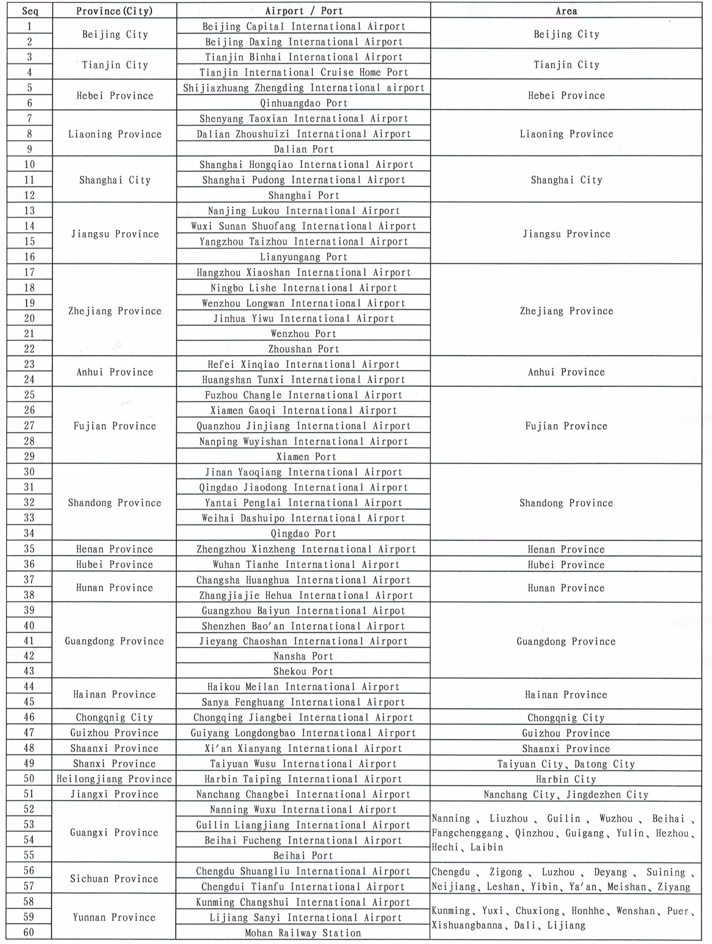 Below is a list of China's city ports implementing in the 240-hour transit visa-free policies: