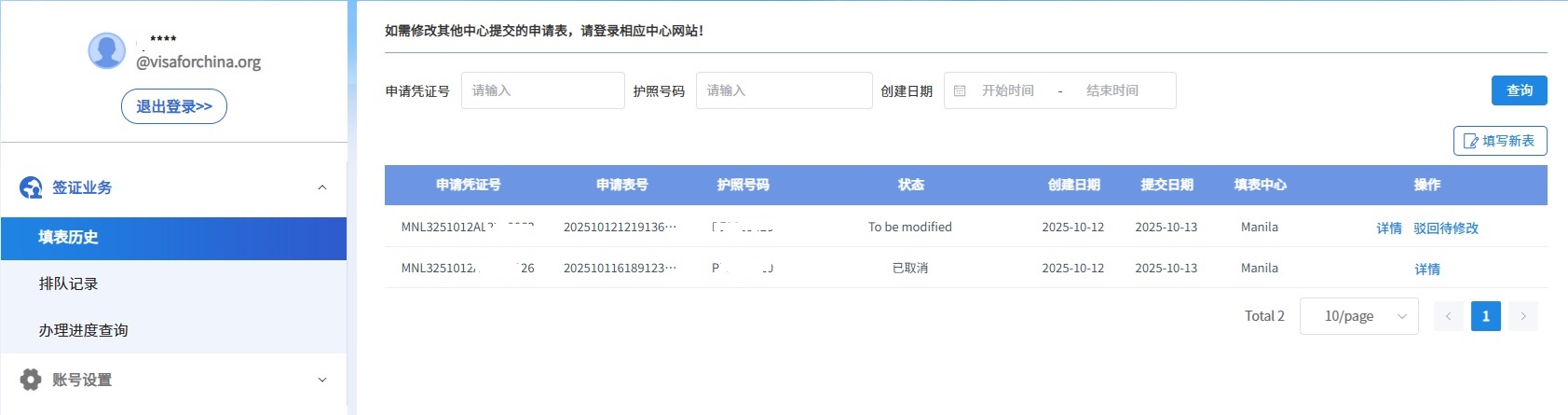 1)使用同一账号登录除马尼拉中心外的其他签证中心网站,例如新加坡中国签证申请服务中心;
