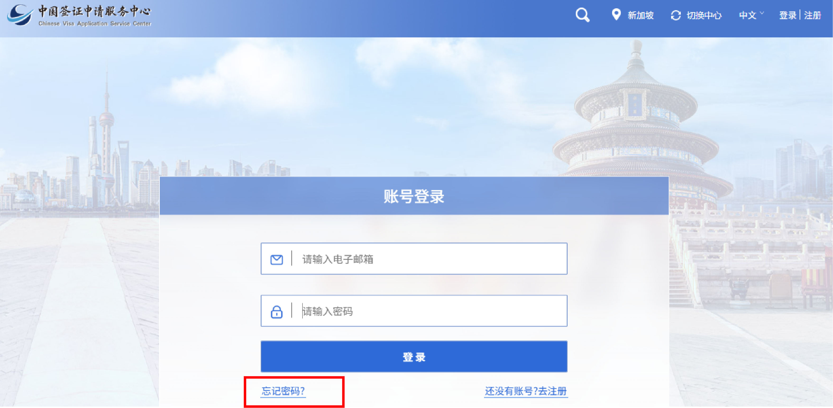 2.请确认登录“新加坡”中心页面,如否,请点击“切换中心”重新选择。