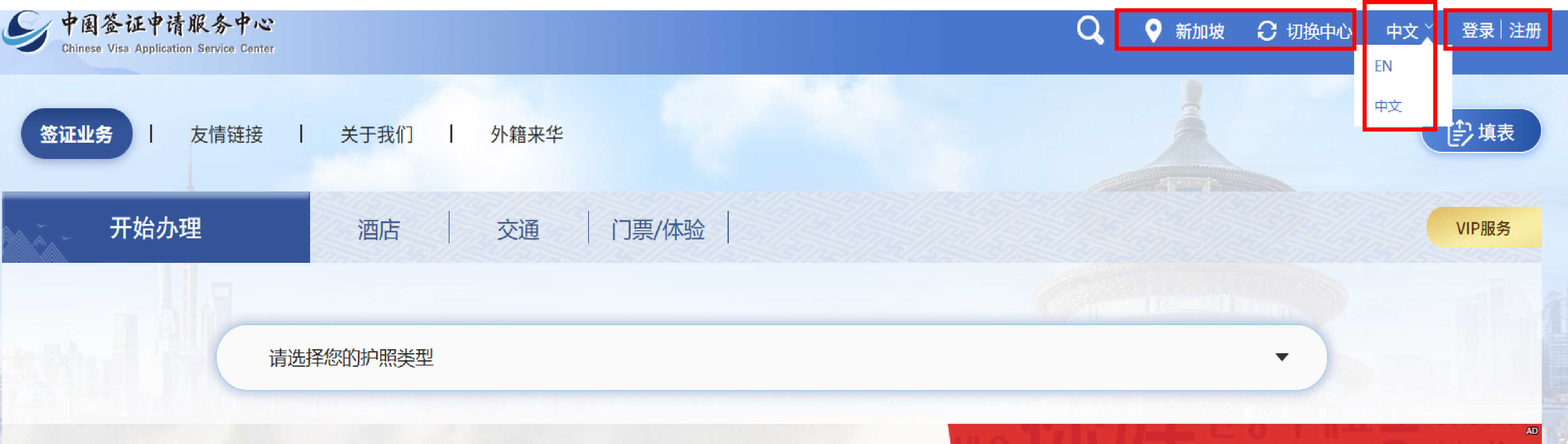 1.输入中心网址www.visaforchina.cn,选择“新加坡”,点击“Take me to the website”。