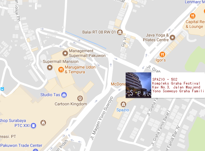 泗水中心地址:Spazio Building - 502, Kompleks Graha Festival Kav No.3, Jalan Mayjend Yono Soewoyo Graha Famili, Surabaya