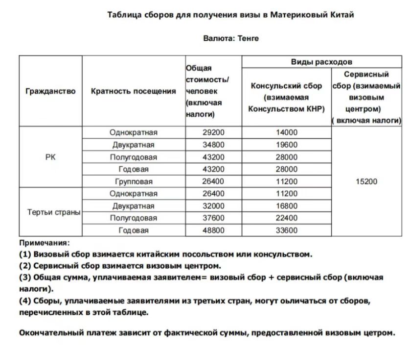 Сервисные сборы китайского визового центра: в дополнение к визовому сбору, сбору за легализацию и срочному сбору, взимаемому китайским визовым центром от имени Посольства Китая в Казахстане, взимается дополнительный сервисный сбор, подробности которого приведены ниже: